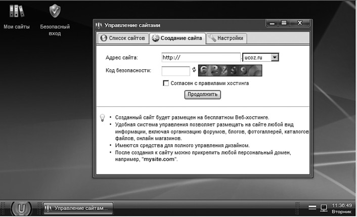 Наше окно Вебтопа пока почти пустое и содержит всего два значка — Безопасный вход и Мои сайты, а поверх него отображается окно Управление сайтами (см. рис. 1.6). Инструменты, вызываемые щелчками на этих значках, позволяют, соответственно, выполнить безопасный вход в панель управления вашими сайтами и отобразить список этих сайтов. В данный момент сайтов у нас нет, поэтому знакомство с этими инструментами мы пока отложим.
