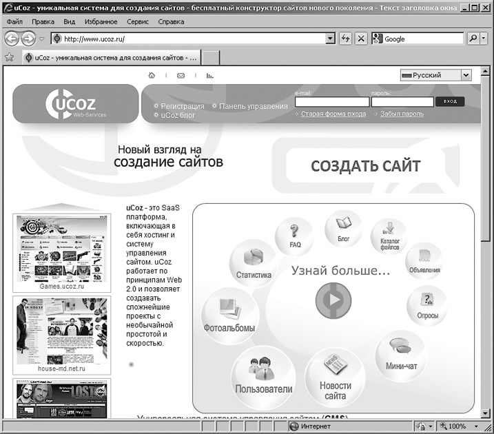 Знакомство с системой uCoz мы начнем с просмотра страницы сайта компании, расположенного по адресу http://www.ucoz.ru (рис. 1.1).