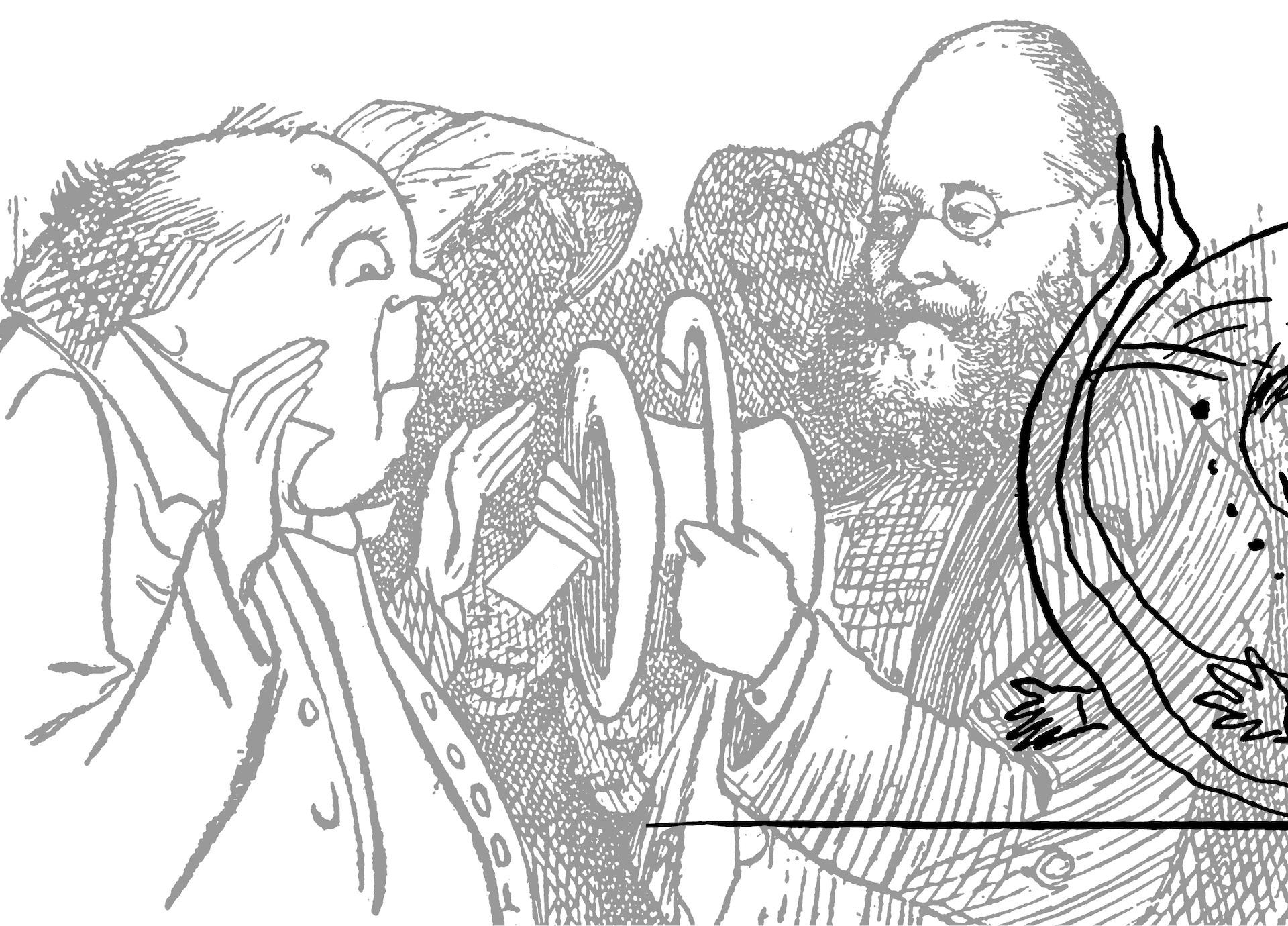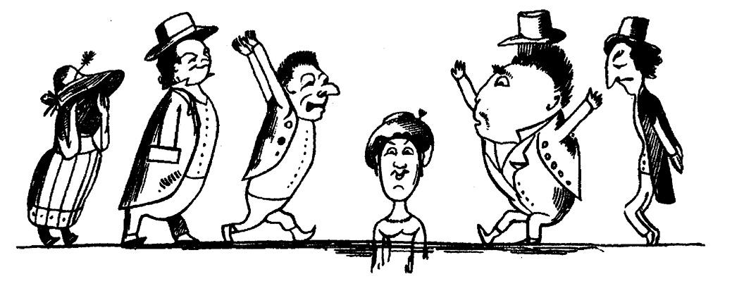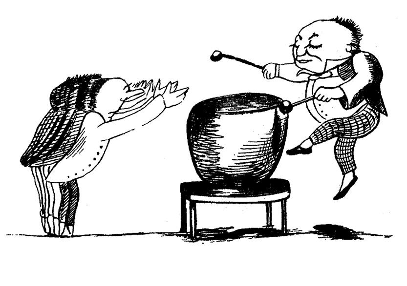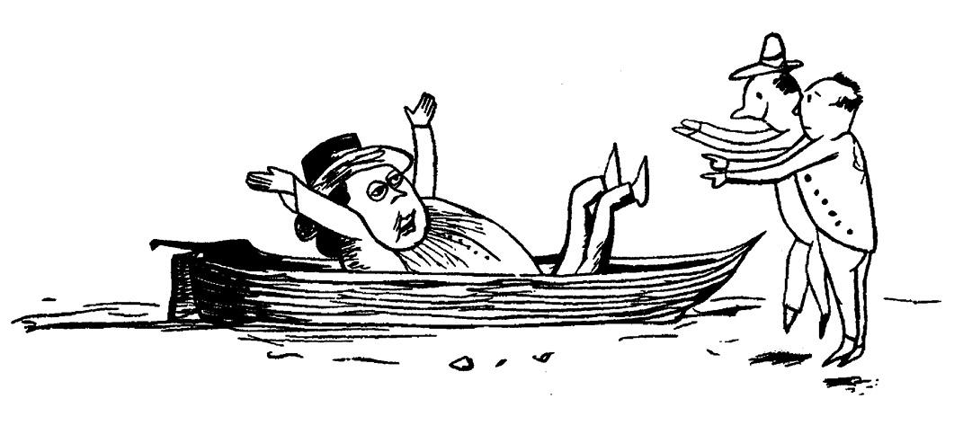 Далее, в третьей и четвертой строке лимерика, совершается то, что Аристотель называет перипетиями. Герой совершает некие поступки, зачастую опрометчивые, и обыкновенно успевает пожать плоды этих поступков. Здесь-то и появляются «они», «другие». Олдос Хаксли в своем блестящем эссе о Лире впервые исследовал этих странных персонажей. Впрочем, ничего особенно странного в них нет. Это законопослушные, хотя и недалекие люди, свидетели удивительных деяний героя. Порой они просто изумлены, порой задают всякие неуместные вопросы. Но бывает, что ведут себя и похуже: злорадствуют, изгоняют из родного города, а то могут и побить любым рифмующимся предметом. «В большинстве своем лимерики, — пишет Хаксли, — не что иное, как эпизоды, извлеченные из истории вечной борьбы между гением и его ближними».
