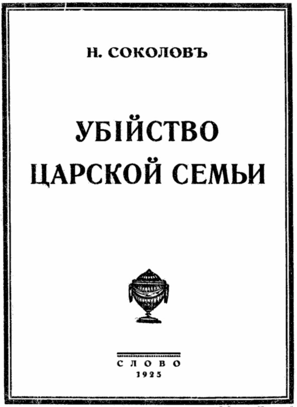 В 1925 году в Берлине вышла книга Н. Соколова «Убийство царской семьи», впервые подробно поведавшая миру о подробностях трагического убийства в подвале «Дома Ипатьева» в Екатеринбурге семьи последнего российского императора.
