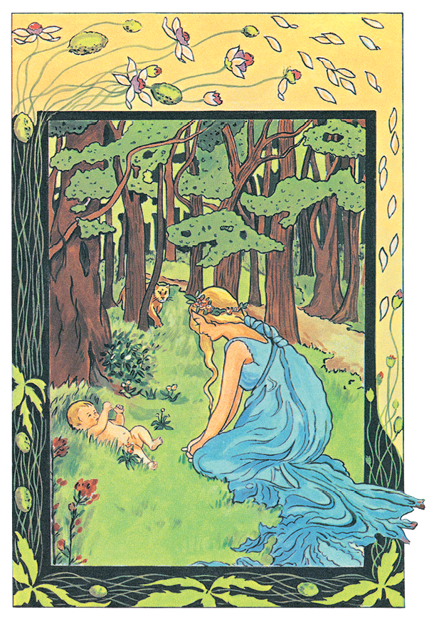 Тихо подошла она к младенцу и опустилась на колени в траву. Её тёмно-зелёные одежды невесомо всколыхнулись, точно паутинка на ветру. На прекрасном лице отразились сперва удивление и любопытство, потом — жалость. Младенец — новорождённый, пухленький, розовощёкий — был так беспомощен. Вдруг он открыл глаза, улыбнулся нимфе, протянул к ней ручки. Нэкиль прижала его к груди и поспешила с ним по лесным тропинкам.