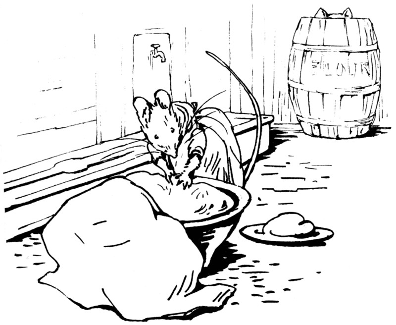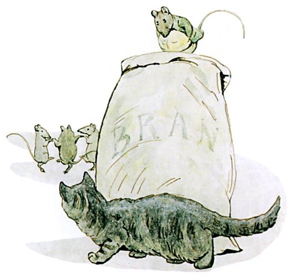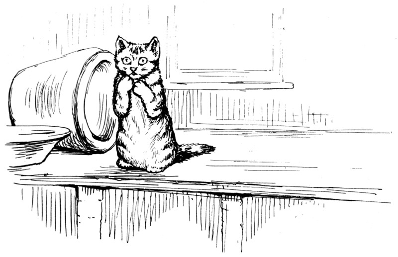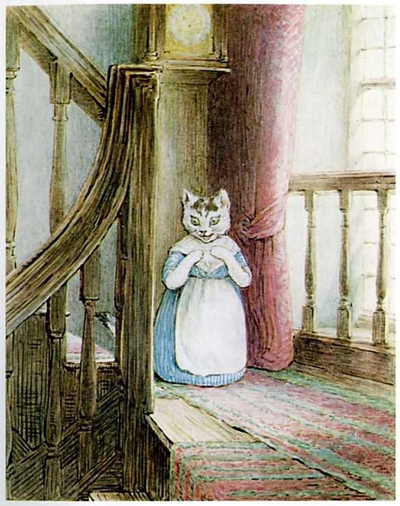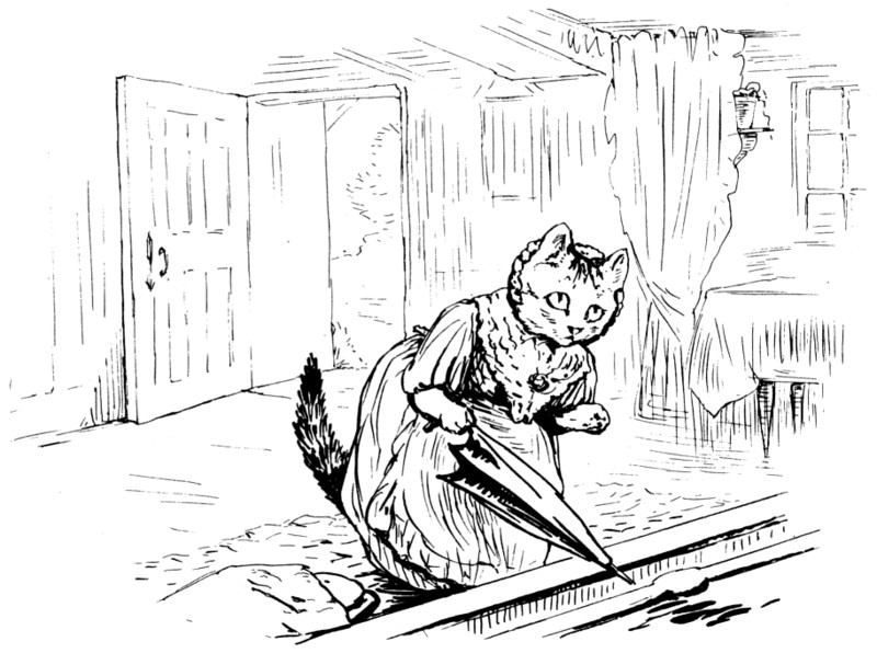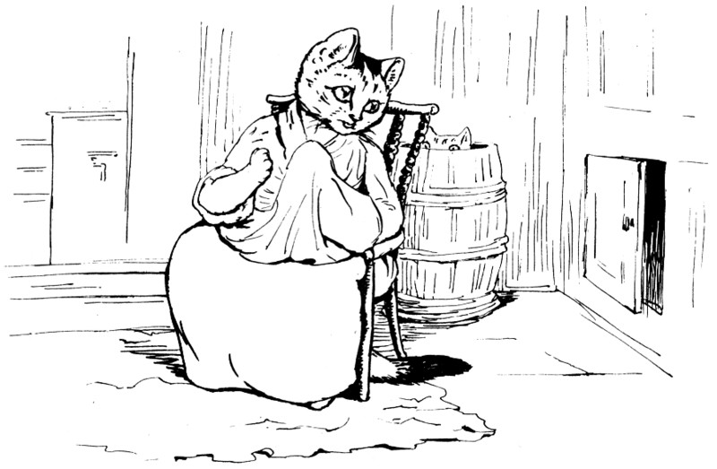 Mrs. Tabitha came downstairs mewing dreadfully—"Come in, Cousin Ribby, come in, and sit ye down! I'm in sad trouble, Cousin Ribby," said Tabitha, shedding tears. "I've lost my dear son Thomas; I'm afraid the rats have got him." She wiped her eyes with her apron.