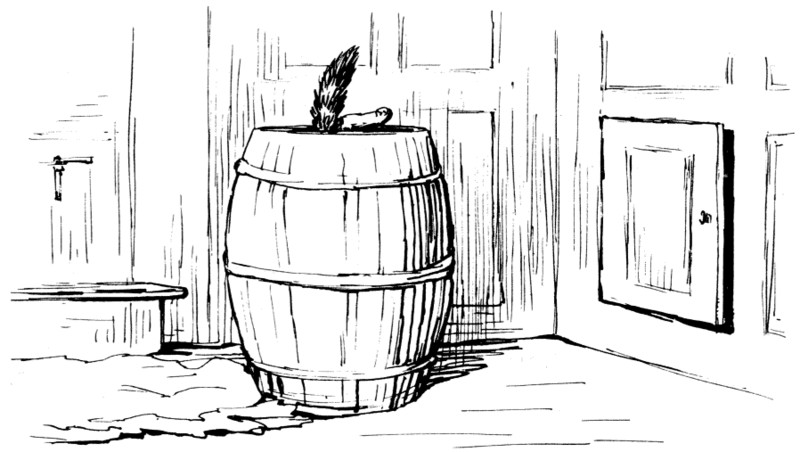 But just at that moment somebody knocked at the front door, and Moppet jumped into the flour barrel in a fright.