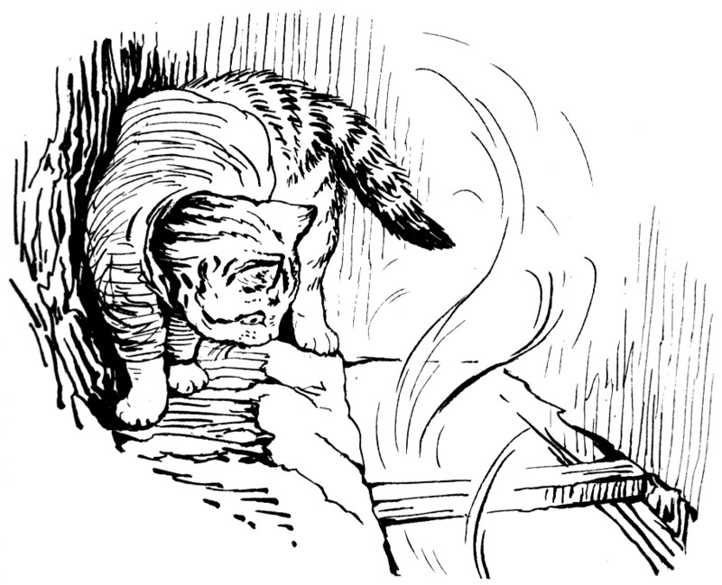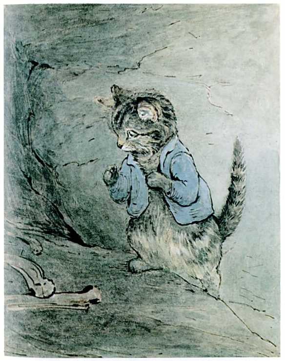 "This seems funny," said Tom Kitten. "Who has been gnawing bones up here in the chimney? I wish I had never come! And what a funny smell? It is something like mouse; only dreadfully strong. It makes me sneeze," said Tom Kitten.