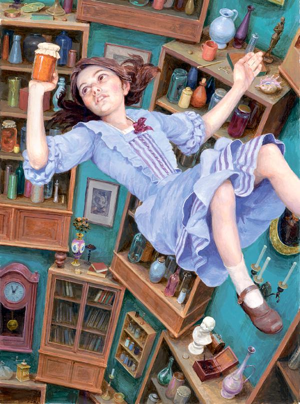То ли колодец был очень глубок, то ли падала она очень медленно, только времени у нее было достаточно, чтобы оглядеться и поразмыслить, что же будет дальше. Сначала она попыталась разглядеть, что внизу, но там было темно, и она ничего не увидела; тогда она принялась смотреть по сторонам и заметила, что стены колодца были уставлены шкафами и книжными полками; кое-где висели на гвоздиках картины и карты. Пролетая мимо одной из полок, она прихватила с нее банку с вареньем; на банке было написано «АПЕЛЬСИНОВОЕ», но – увы! – она оказалась пустой. Алиса побоялась бросить банку вниз – как бы не убить кого-нибудь! – и умудрилась на лету засунуть ее в какой-то шкаф5.