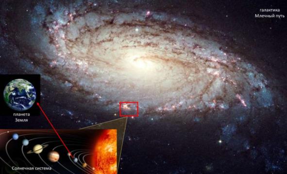 Ваш город — страна — континент — планета Земля — Луна — орбита Луны — околоземные астероиды — планеты земной группы — планеты-гиганты — пояс Койпера — карликовые планеты — внутреннее облако Оорта — внешнее облако Оорта — соседние звезды — местное межзвездное облако — Местный пузырь — Спиральные рукава — Млечный Путь — соседняя галактика — Местная группа галактик — Местное сверхскопление галактик — Великая стена Слоуна — Вселенная.