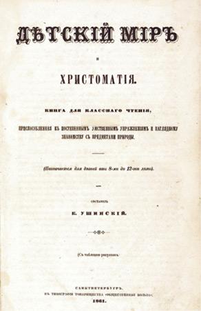 Ушинский, К. Детский мир и христоматия. Книга для классного чтения, приспособленная к постепенным умственным упражнением и наглядному знакомству с предметами природы. СПб.: В тип. Т-ва «Общественная польза», 1861. XIV, XVIIII, [1], 365, II, [1], 162 с.; 1 л. ил.