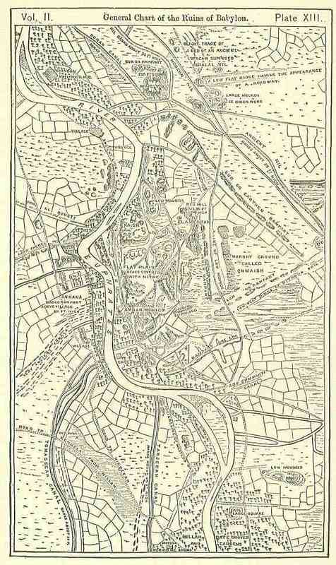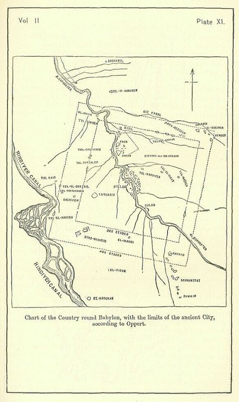 The limits of Babylonia Proper, the tract in which the dominant power of the Fourth Monarchy had its abode, being almost identical with those which have been already described under the head of Chaldaea, will not require in this place to be treated afresh, at any length. It needs only to remind the reader that Babylonia Proper is that alluvial tract towards the mouth of the two great rivers of Western Asia—the Tigris and the Euphrates—which intervenes between the Arabian Desert on the one side, and the more eastern of the two streams on the other. Across the Tigris the country is no longer Babylonia, but Cissia, or Susiana—a distinct region, known to the Jews as Elam—the habitat of a distinct people. Babylonia lies westward of the Tigris, and consists of two vast plains or flats, one situated between the two rivers, and thus forming the lower portion of the "Mesopotamia" of the Greeks and Romans—the other interposed between the Euphrates and Arabia, a long but narrow strip along the right bank of that abounding river. The former of these two districts is shaped like an ancient amphora, the mouth extending from Hit to Samarah, the neck lying between Baghdad and Ctesiphon on the Tigris, Mohammed and Mosaib on the Euphrates, the full expansion of the body occurring between Serut and El Khithr, and the pointed base reaching down to Kornah at the junction of the two streams. This tract, the main region of the ancient Babylonia, is about 320 miles long, and from 20 to 100 broad. It may be estimated to contain about 18,000 square miles. The tract west of the Euphrates is smaller than this. Its length, in the time of the Babylonian Empire, may be regarded as about 350 miles, its average width is from 25 to 30 miles, which would give an area of about 9000 square miles. Thus the Babylonia of Nabopolassar and Nebuchadnezzar may be regarded as covering a space of 27,000 square miles—a space a little exceeding the area of the Low countries.