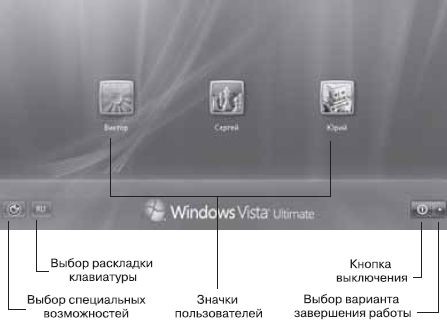 • Процесс загрузки Windows Vista обычно останавливается с выводом экрана приветствия (рис. 1.1) со значками пользователей, зарегистрированных на этом компьютере.
