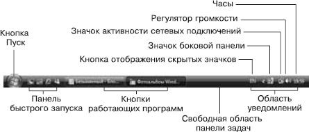 • Панель задач. Расположена в нижней части Рабочего стола. В левой части Панели задач размещается кнопка с логотипом Windows, которую еще называют кнопкой Пуск. Рядом с ней находится панель быстрого запуска со значками часто используемых программ, а справа – область уведомлений с часами и индикатором клавиатуры. Назначение основных элементов Панели задач показано на рис. 1.3.