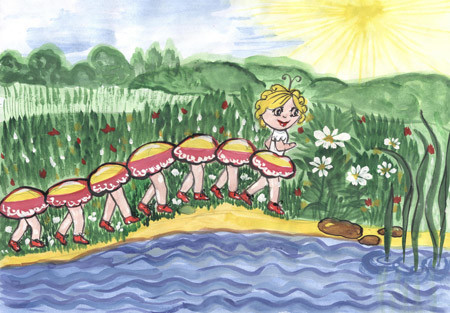Наталка сиділа на березі і грала на дудочці. Та так ніжно і гарно, що стоніжка Ніна, яка бігла повз неї, поспішаючи у своїх справах, зупинилась і заслухалась.