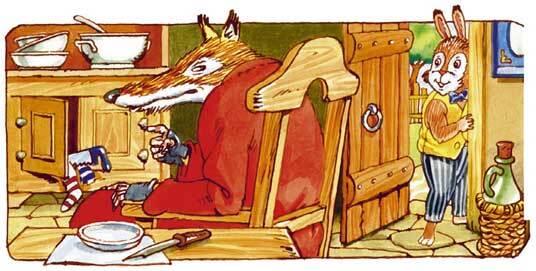 Прибегает, слышит – стонет кто-то. В дверь заглянул и видит – сидит Лис в кресле, весь закутанный в байковое одеяло, а вид у него слабый-слабый. Глянул Кролик по сторонам – нигде не видно обеда. Миска стоит на столе, а рядом острый ножик.
