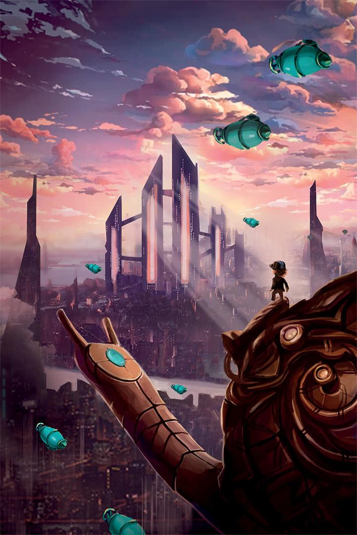 Наконец, после нескольких стремительных снижений и потери почти всех конфет из мешочка, драконья упряжка опустилась на берег острова. Джинглики огляделись. Кругом возвышались странные здания. Казалось, кто-то разобрал много-много машин и механизмов, перемешал все детали, а потом слепил из них эти дома. Вдобавок многие из них были украшены выступами непонятного назначения, колёсами и шестернями. Рядом возвышался маяк, сделанный из гигантских металлических труб и увенчанный короной из причудливых антенн. Ветер завывал в нём, как в гигантском органе.