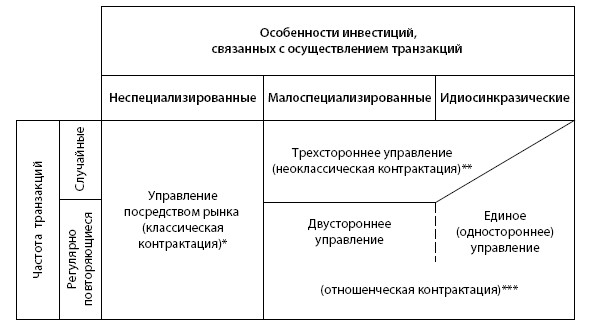 Механизм рыночного управления контрактами является основной структурой управления неспециализированными транзакциями – как случайными, так и регулярно повторяющимися. Трехстороннее управление необходимо при осуществлении случайных транзакций, эффективность которых повышается при использовании специфических активов, что предопределяет важность непрерывности отношений.