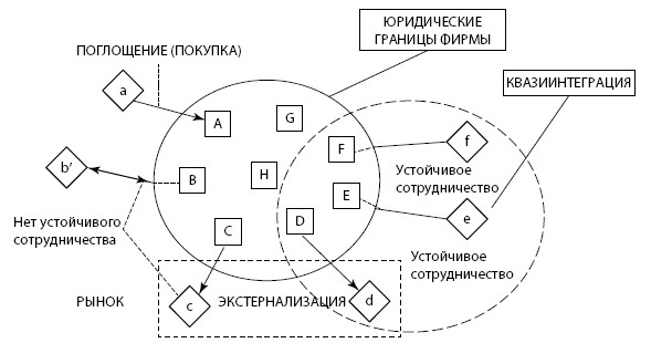 Под квазиинтеграцией понимают объединение экономических субъектов, предполагающее развитие устойчивых долгосрочных связей между ними при отсутствии юридически оформленного трансфера прав собственности. Реагируя на вызовы современной динамичной внешней среды, фирма может осуществлять «внутреннюю виртуализацию» – введение элементов рыночного регулирования во внутрифирменную деятельность [Zenger, Hesterly, 1997]. Другой возможный вариант – вывод активов из собственности компании и переход к аутсорсингу, т. е.