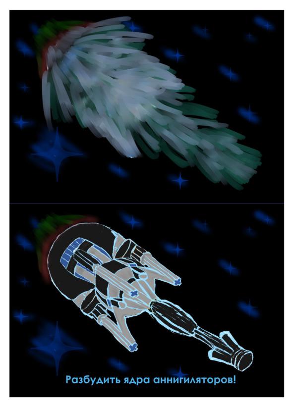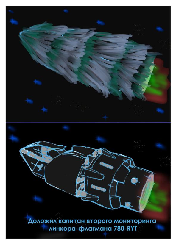 Покров древесных кораблей линял с «лета» на «осень», а то и «зиму». Камуфляжи отключались. Маскировочные листья сворачивались. Космолеты складывали ветви, играли ветвями. Древесные корабли плавно из «дубов», «пальм», «елок» и прочих лесных колонн перерождались в искусственные боевые корабли. Пинтиибские космолеты разогревали оружие, повышали лимиты энергоснабжения комплексов наведения и защиты. Созвездные моряки спешно пристегивали щитки к скафандрам, повторяли про себя служебные концентрирующие мантры.