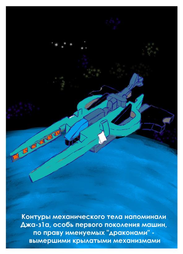 Путь послушания завел в «ангар» на 2й палубе, который Прабодх на схеме 780-RYT точно не видел. В этом ангаре, нет, «гараже», возлегал самолет в пестрой раскраске, выдававшей не принятый на вооружение прототип. Контуры механического тела напоминали Джа-з1а, особь первого поколения машин, по праву именуемых «драконами» — вымершими крылатыми механизмами, которые в XXIV в. только возбуждают воображение диковинным и задушенным руками человека могуществом.