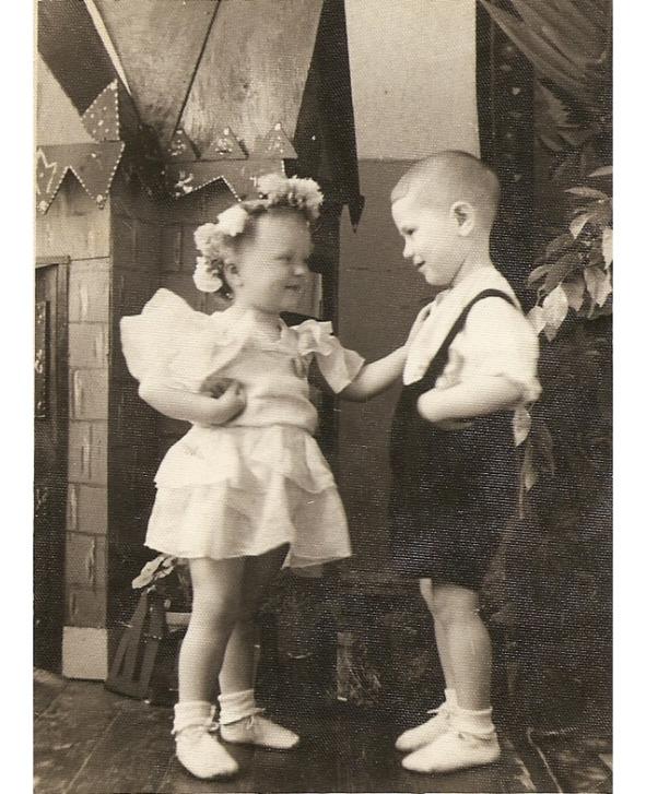 Нас поставили друг против друга, лицом к лицу, чтобы сфотографировать, и чтобы мы попрощались. Взрослые, видимо, так представляли наши отношения — как у взрослых. Я гляжу на неё с созерцательным умилением. Она — на меня с нежным доверием и ямочками на щёчках. Такие влюблённые взгляды у трёхлетних детей выпросить невозможно. Они были естественны. Едва что-то умещавшая маленькая душа уже переполнялась чувствами. Эта девочка была мне всегда рада и щебетала вокруг. Что конкретно мне в ней нравилось? Возможно, просто образ белокурой девочки. Просто любил то, что передо мной бегало, прыгало и чирикало. На фото она вся в белом, с веночком из розочек на белокурых волосах. Я с чубчиком на остриженной головке, в белой рубашке и в вельветовых чёрных бейджиках на «плечиках». Помнятся женские голоса, и среди них мамин: «Ну поцелуйтесь же на прощание». Фотограф щёлкнул.