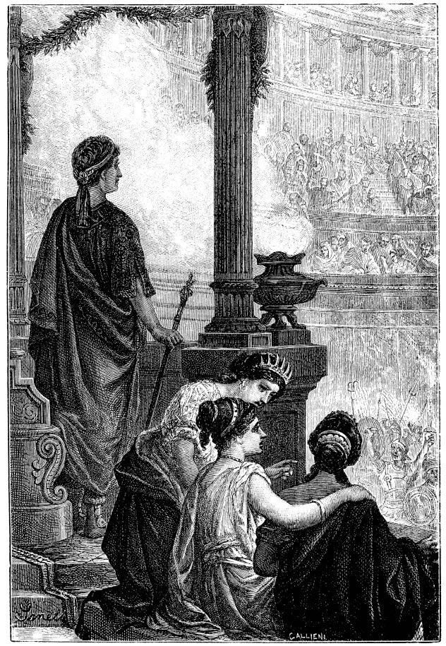 Войдя в цирк, Помпей занял место на площадке оппидума, близ весталок, сидевших уже на своих местах в ожидании кровавого зрелища, приятного этим девственницам, посвятившим себя культу непорочной богини. Он приветствовал народ изящным поклоном и, поднося руки к губам, посылал поцелуи в знак благодарности.
