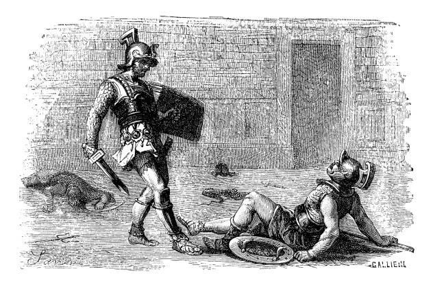 Ободренный криками толпы, мирмиллон все сильнее наступал на ретиария, который, страшно побледнев, старался держать противника в отдалении, размахивая трезубцем, и в то же время кружил вокруг мирмиллона, напрягая все силы, чтобы схватить свою сеть. Внезапно мирмиллон, отбив щитом трезубец противника, проскользнул под ним, подняв левую руку и заставив трезубец ретиария скользнуть по щиту. Меч его уже готов был поразить грудь врага, как вдруг последний, оставив трезубец на щите мирмиллона, стремительно бросился к сети, но все же не настолько быстро, чтоб избежать меча: ретиарий был ранен в левое плечо, из которого брызнула сильной струей кровь, и все же он быстро убежал со своей сетью. Отбежав шагов на тридцать, он повернулся к противнику и вскричал громким голосом: