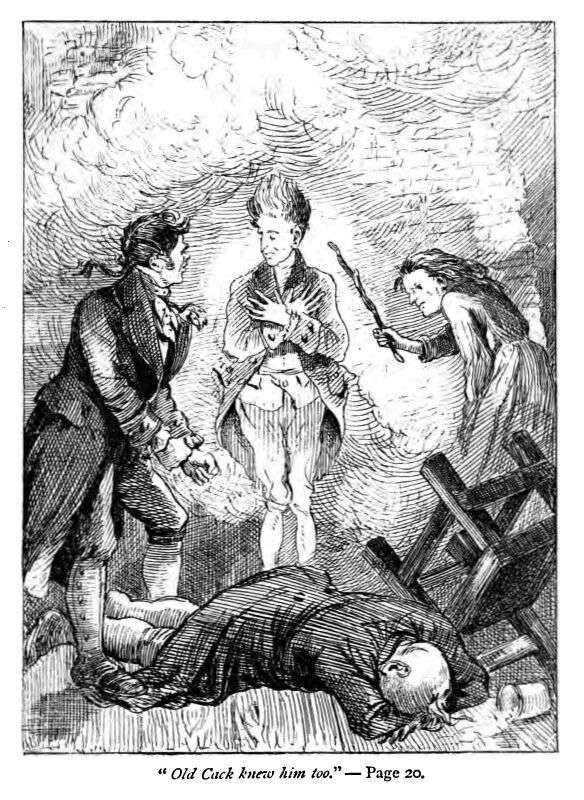 “Then old Ketury got up, and reached her stick up chimbley, and called out louder, ‘Come down, come down! let’s see who ye be.’ And, sure enough, down came a pair o’ legs, and j’ined right on to the feet: good fair legs they was, with ribbed stockings and leather breeches.