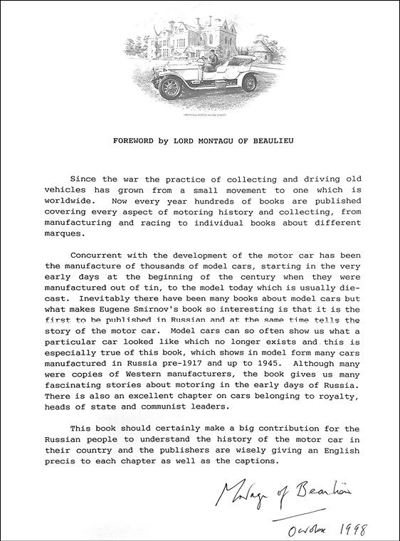 Наклонности к собирательству я обнаружил с ранних лет. Мне не было и десяти, когда мама, вернувшись из очередной командировки, привезла мне чу́дную гэдээровскую машинку Wanderer 1904 года [8]. С этого бесценного подарка из несуществующей ныне страны началось мое путешествие в удивительный мир коллекционирования, в том числе моделей старинных автомобилей (от паровой телеги Кюньо до 1930 г.). Я посвятил этому увлекательному занятию несколько десятилетий, составив, без ложной скромности, многомерное по содержанию и крупное по объему собрание из более чем полутора тысяч экземпляров. Годы и опыт коллекционирования превратились в исследование и затем оформились в рукопись, за которой должна была последовать книга на эту еще не освоенную в России конца девяностых тему. К несчастью, компьютер, где хранилась единственная электронная версия материала, был украден. Резервные копии в то время еще распространены не были, да и автор, признаюсь, по наивности, не озаботился этим. Сухой остаток: 1) книга не состоялась; 2) на восстановление рукописи не было ни сил, ни желания; 3) печальный опыт извлечен. От всего труда (около 250 страниц) остались лишь рабочие записи и предисловие, которым, пользуясь случаем, хотел бы здесь поделиться с заинтересованным читателем. Написано предисловие признанным знатоком автомобильной истории, коллекционером и основателем Национального автомобильного музея [9], моим вдохновителем и наставником, ушедшим другом и единомышленником Эдвардом, лордом Монтегю [10]. Представляю его текст в оригинале, без перевода. А еще, пользуясь правом автора, я решил опубликовать в конце этой книги акварель Алены Лимановой, которую она создала тридцать лет назад специально для «Парада ветеранов».