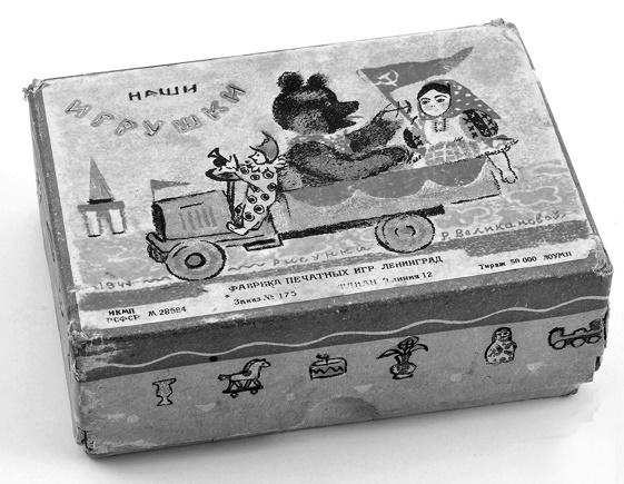Схожая судьба ожидала «игрушечную графику», которая в большинстве своем не подписана, а потому не имеет авторства. Недооцененная и говорящая тихим голосом, она и по сей день не удостоилась должного внимания исследователей и искусствоведов, не введена в научный оборот, не опубликована и является terra incognita. Между тем достаточно взглянуть на этикетку поздних 1940‑х — 1950‑х, чтобы заметить, сколько в ней общего с детской книжной графикой, в особенности той, где главным героем выступает игрушка.