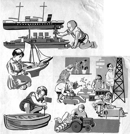 У Ечеистова она призвана «объединить детей в интересной коллективной игре, ширить кругозор, увлекать образами современной действительности, а также вместе, дружно и творчески действовать» [22]. Художник погружает нас в атмосферу детской игры, дополняя ее точными изображениями главных игрушек новой эпохи: трактора «Красный Путиловец», веялки, броневика, траулера «Пятилетка», крейсера «КИМ», яхты «Крупская». При этом Ечеистов выводит игрушку на первый план, масштабирует ее, придавая ей значимость.