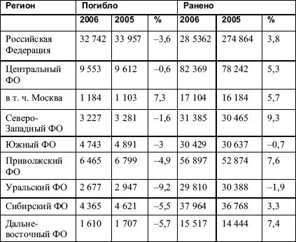 Таблица 0.2. Количество погибших и раненых в ДТП в 2006 году[3]