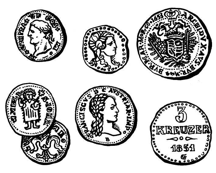 Примеры эмблем (надписи даны курсивом, подписи – прямым шрифтом; подписи приведены на русском, латинском, французском, немецком и английском языках):