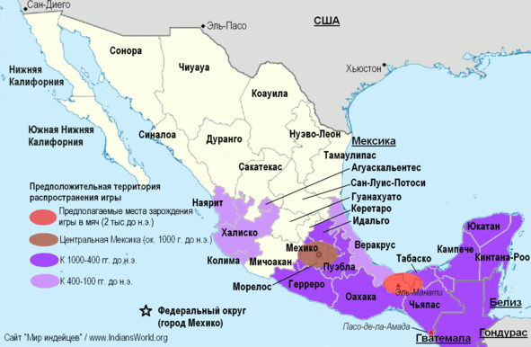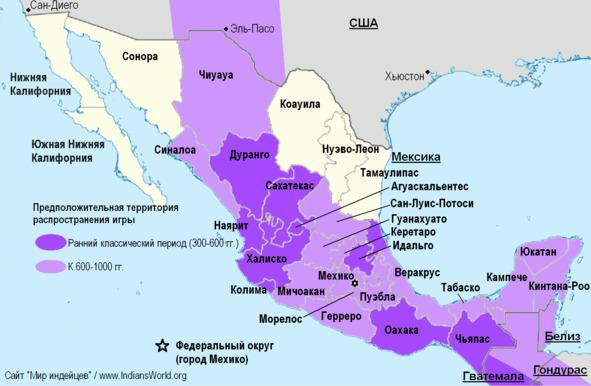Так или иначе, вероятно, от ольмеков игра проникла в Центральную Мексику, а затем к середине формативного периода (400—100 годы до нашей эры) распространилась по всей Месоамерике (с 300 года до нашей эры в Чьяпас, долину Оахака, на запад и далее).[3] Примерно в это время (или чуть позже) игра в мяч пускает корни на территории современных мексиканских штатов Колима, Наярит, Халиско и Веракрус — об этом свидетельствую погребальные подношения в виде статуэток, принадлежащих к так называемой культуре классического Веракруса.[4]