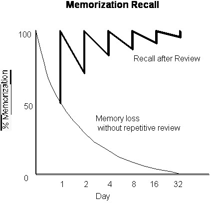 Forgetfulness is a matter of periodic review. Memorization through repetition and forgetfulness follow a similar pattern. Each is gained or lost by halves for the same time period. The following graph illustrates the phenomenon.