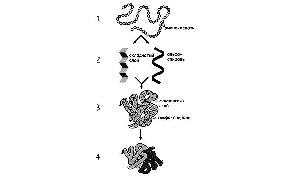 Рис. 3.Структура белка. 1. Первичная. 2. Вторичная. 3. Третичная. 4. Четвертичная.