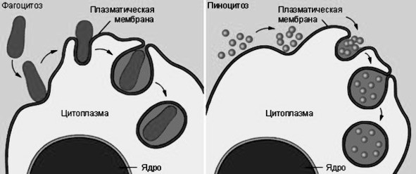 Рис. 6.Схема фагоцитоза и пиноцитоза.