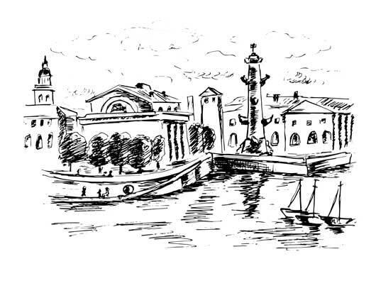 По легенде, автор композиции на Стрелке французский архитектор Тома де Томон долго не мог закончить свой амбициозный проект. Случайно помогла жена! Однажды утром она принесла мужу завтрак и поставила овальный поднос прямо на чертеж, симметрично добавив две чашки кофе.