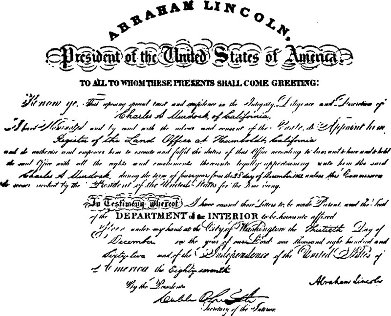 Presidential Commission As Registrar of the Land Office At Humboldt, California