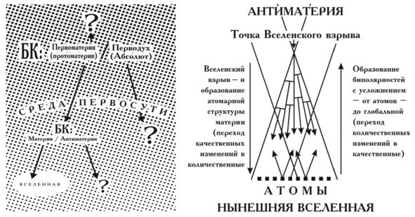 Чтобы понять масштабы истинного воздействия Разума на окружающий мир, вновь напомним, что в едином Пространстве, в СРЕДЕ ПЕРВОСУТИ, кроме образовавшейся нашей материальной Вселенной не могут не быть и некие иные сложные образования, существующие в соответствии с действием закона биполярности (о сущности и этого закона, и вообще законов биполярной диалектики подробнее — ниже). Поскольку Материя и доматериальная составляющая Пространства — это единое целое, мы, воздействуя на окружающий мир, вторгаемся не просто в область действия многочисленных БК доступного нам материального мира, но и обязательно разрушаем конфигурации мира доматериального, являющегося неотъемлемой частью Материи. Наше допущение, что биполярные конструкции (БК) лежат в основе механизма, образующего сочетание атомарного материального и доматериального, позволяет утверждать, что механизм человеческого воздействия, последствия его, еще более сложны, чем представляется нам на первый взгляд. А если вспомнить, что и мы сами — не просто часть Материального, но и древнего Доматериального, а, следовательно, воздействуем на все вокруг не только тем, что иногда принято называть «физическим телом человека», но и возможно — некими доматериальными БК, являющимися частью каждого из нас, на Материю и одновременно — нематериальные БК и сплав биполярностей в среде соединения атомов и доматериальных состояний пространства, тогда получается, что воздействие человека на окружающую среду фактически носит характер вторжения слона в посудную лавку — сравнение, как мне кажется, и весьма образное и очень наглядное в данном случае.