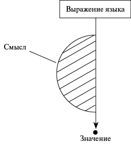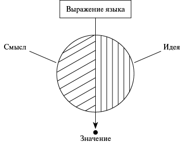 Выражения языка можно рассматривать как знаки. Знак, в таком контексте, ─ это выражение, обозначающее какой-то предмет. Под предметом понимается все, что может быть как-то названо. Примеры знаков: река Волга, кошка. Предметным значением (или просто значением) выражения «река Волга» является сама эта река, а смысловым значением ─ какая-то из информаций о Волге, выраженная в языке, например, информация о том, что это самая большая река в Европе, а также зрительный образ этой реки или какое-то иное представление о Волге. Первый вид смыслового значения (самая большая река в Европе) называется смыслом знака, а второй ─ образным представлением. Образное представление называется также идеей. Знаковую ситуацию можно представить графически: