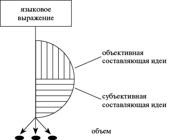 Недоопределенность значений имен, не имеющих смыслов, обусловлена тем, что зрительные образы и интуитивные представления об обозначаемых такими именами предметах во многих случаях у разных людей являются различными, т. е. содержат в себе элементы субъективности, что представлено на следующей схеме.