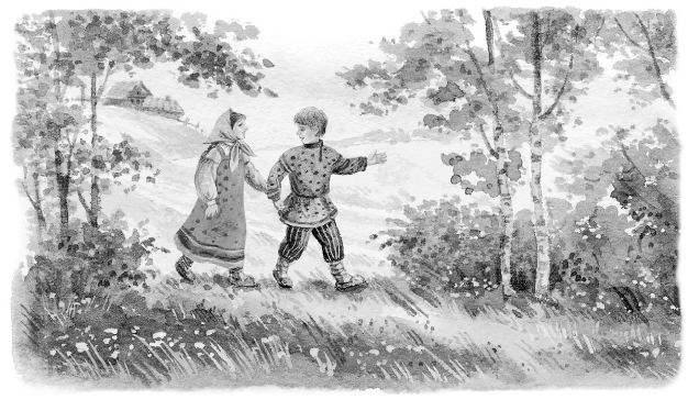 – Знаешь ли что? – сказал брат сестре. – В школу мы ещё успеем. В школе теперь душно и скучно, а в роще, должно быть, очень весело. Послушай, как кричат там птички; а белок-то, белок сколько прыгает по веткам! Не пойти ли нам туда, сестра?
