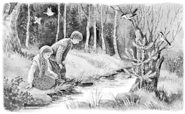 Детям стало скучно, что все заняты своим делом и никто не хочет играть с ними. Они подбежали к ручью. Журча по камням, пробегал ручей через рощу.