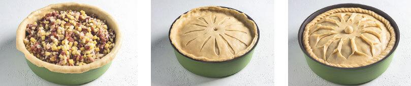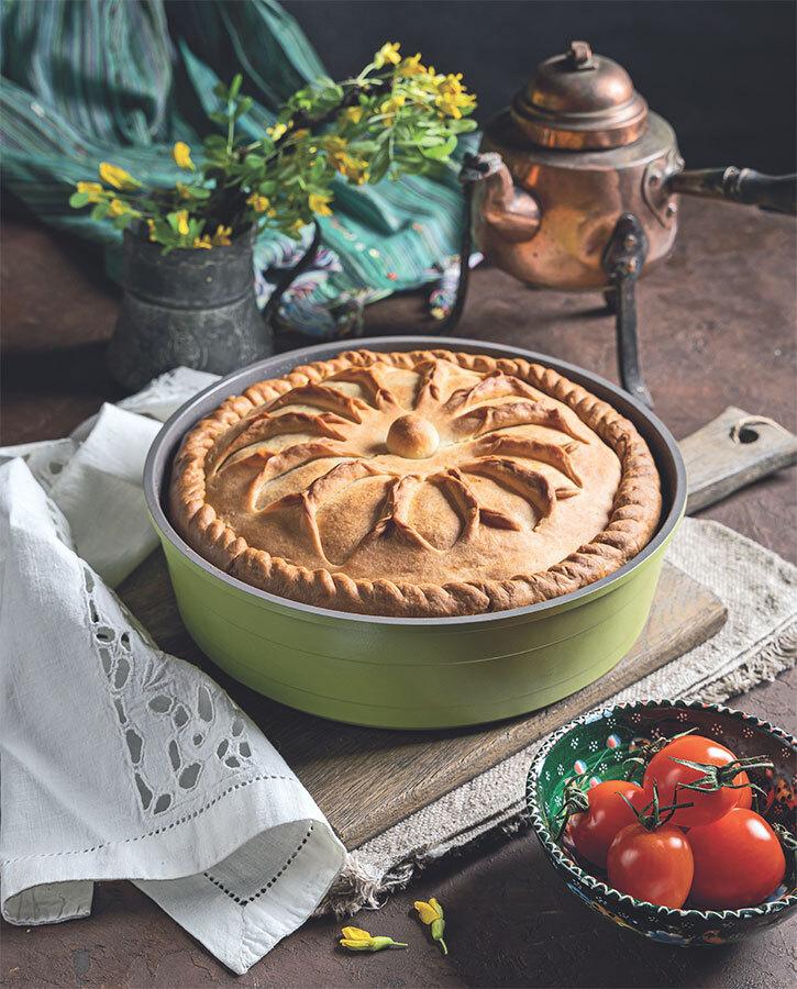 Затем большой шар раскатываем в пласт чуть больше размеров формы (у меня диаметр 24–26 см). Выкладываем пласт теста в форму так, чтобы края немного выступали за ее пределы, формируем дно и бортики пирога. Наполняем начинкой и раскатываем 2 небольших шарика в тоненькие лепешки. Одну «лепешку» выкладываем на начинку, а на другой делаем надрезы по кругу и выкладываем поверх первой (см. фото). Плотно защипываем края теста, делаем узор косичкой. Также раскрываем надрезы вдоль на верхушке пирога по кругу, получается красивый цветочек, в центре которого нужно проделать небольшое отверстие для выхода пара. Накрываем его отдельным шариком теста. В это же отверстие во время выпечки, убрав предварительно шарик, можно заливать бульон для еще большей сочности начинки.