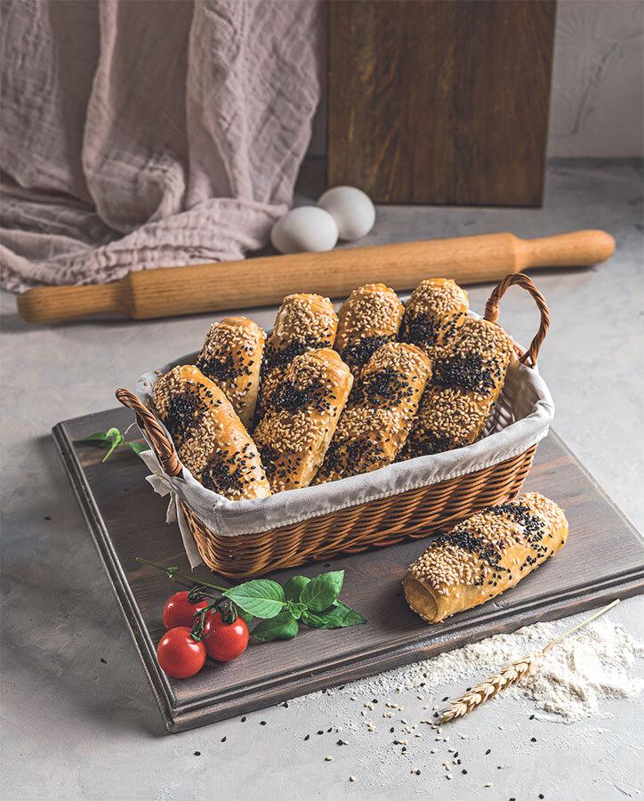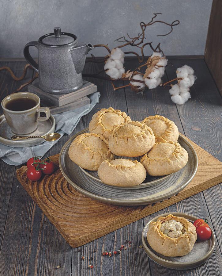 Сформированные пирожки смазываем смесью желтка и молока, по желанию присыпаем кунжутом или черным тмином и выпекаем в заранее разогретой духовке при 180 °С около 40–45 минут до образования золотистой корочки.