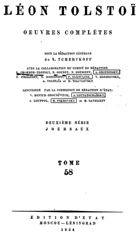 ТТ 1, 2, 3, 4 — Толстой и о Толстом. Новые материалы, изд. Толстовского музея, 1 — М. 1924, 2 — М. 1926, 3 — М. 1927, 4 — М. 1928.