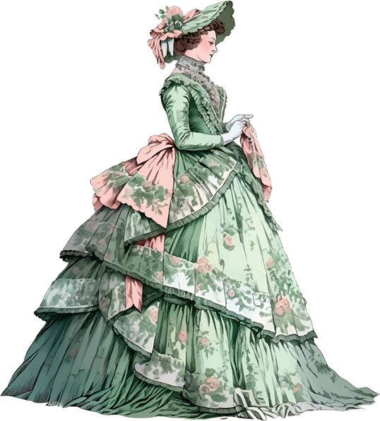 «Не страшась ужасов зимы, дамы были в полупрозрачных платьях, которые плотно обхватывали гибкий стан и верно обрисовывали прелестные формы, – поистине казалось, что легкокрылые Психеи порхают на паркете. Но каково, подумайте, было дородным женщинам?!» – изумлялся современник. Крупные дамы не скучали. Они умело приспосабливались к идеалам античности: глубочайшие декольте слегка прикрывали кружевными, газовыми, прозрачными косынками, шалями… или искусно драпировали тканями тяжёлого шёлка, бархата. Цвет бутылочного стекла, фиолетовый, коричневый… эти тона ценились взрослыми матронами.