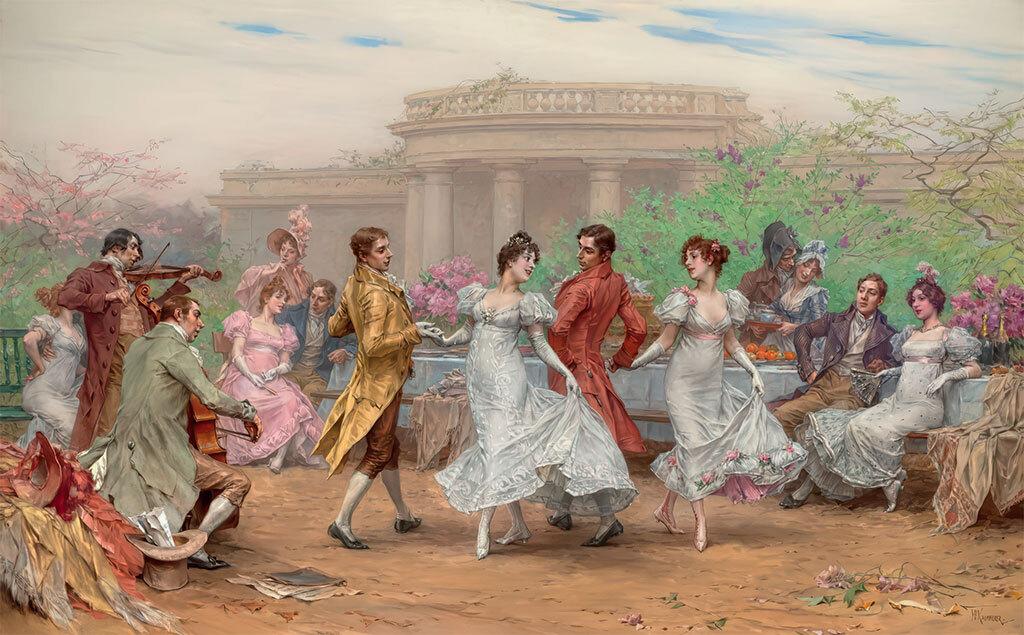 Полонез – прогулка, представление, шествие, торжественная процессия. Дамы выстраивались в ряд, кавалеры выбирали себе партнёршу: он кланяется, протягивает руку – глубокий реверанс, поклон – реверанс… неспешный шаг… «Полонез, – писал Ференц Лист, – совершенно лишён быстрых движений. Его цель – отличить мужчину, выставить напоказ его красоту, манеры, учтивую осанку».