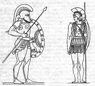 Греческие латники. Бронзовый панцирь скреплялся из двух половин, защищавших грудь и спину; снизу пристегивался кожаный или войлочный передник, часто с нашитыми металлическими полосами. На голове шлем с гребнем: у одного воина с забралом, у другого – с открытым лицом; на ногах у одного – поножи, подбитые кожей. Живот был прикрыт только щитом.