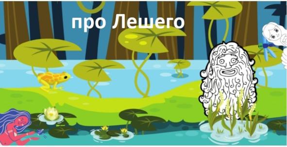 Среди болота на коряге сидит Леший и чешет свой затылок. Кикимора выныривает из воды.
