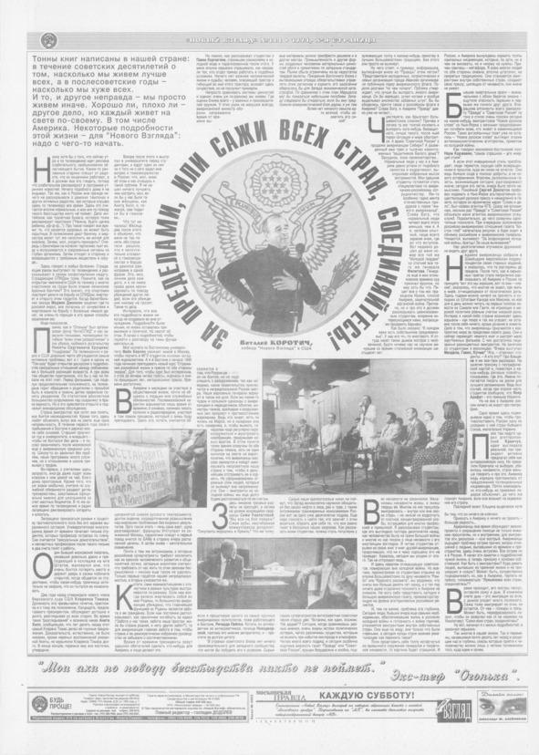 На газетных полосах непримиримо соседствовали Леонид Радзиховский и Виталий Коротич, Эдуард Лимонов и Владимир Вольфович, моя антисоветчина перемежалась с консервами от коммунизма, патриотизма и этатизма.