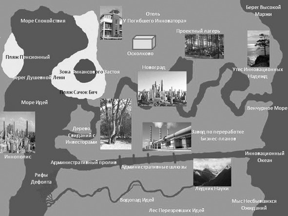 Столица ОбРеТУ Манагерия, город Иннополис, расположен на берегу моря Идей на мысе Инновационных Ожиданий. Море Идей весьма удобно для плавания, здесь всегда дуют благоприятные ветра. Здесь построен порт, из которого уходят в плавание корабли, отправляющиеся на поиски Великой Инновационной Идеи и Берега Высокой Маржи.